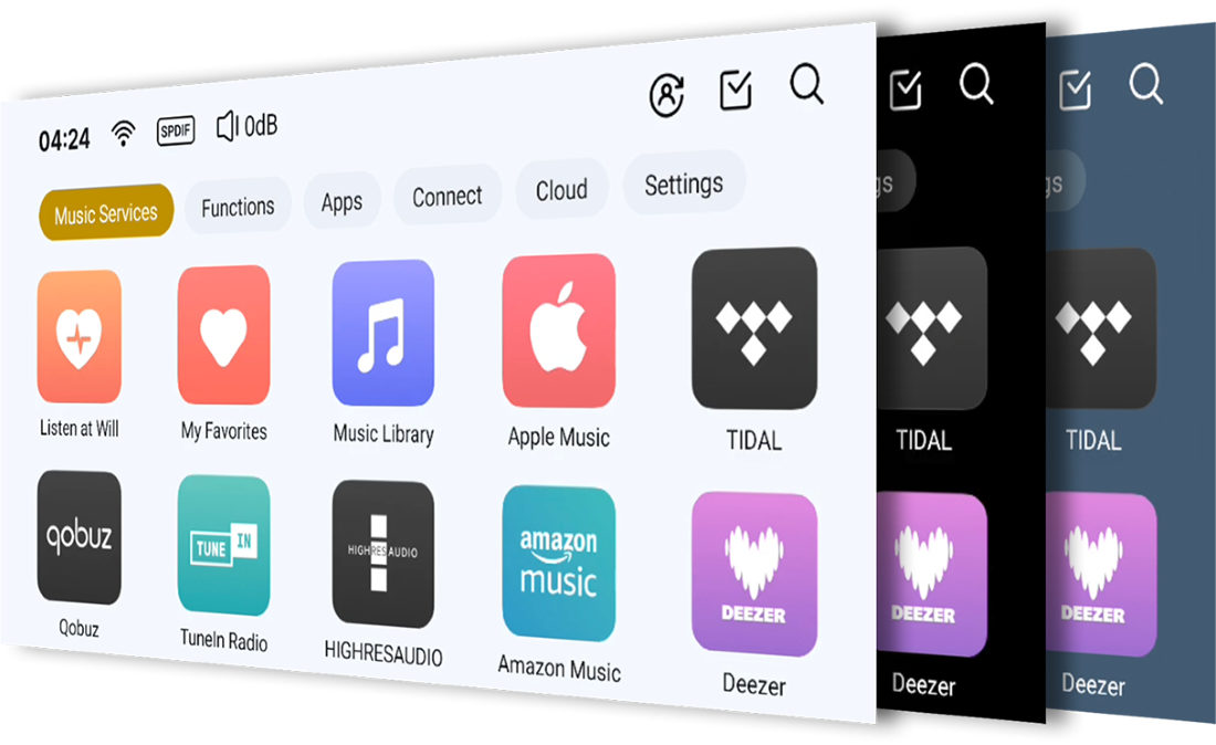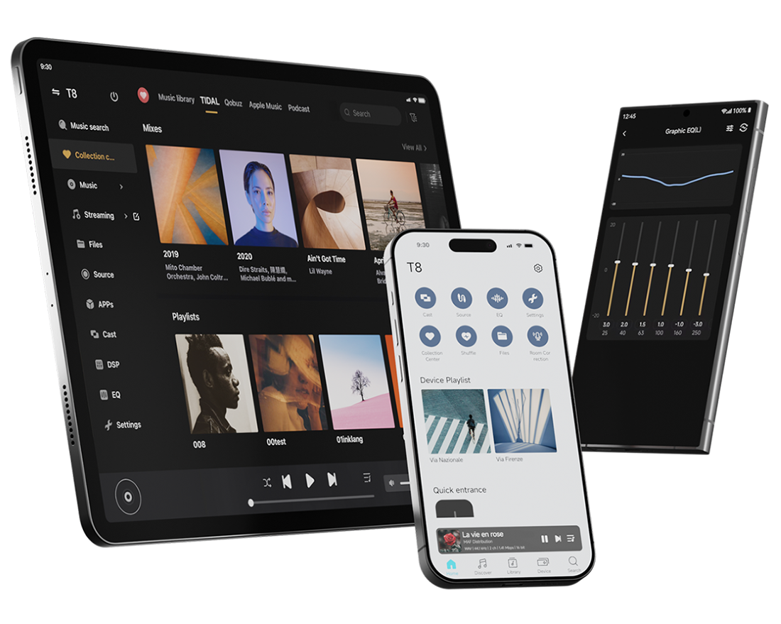 內建支援多項全球主流音樂串流服務的程式,並深度整合 TIDAL、Qobuz、IDAGIO、Amazon Music、TuneIn Radio、Presto Music、KKBOX、 Radio Paradise、Deezer 以及其他更多平台。有了 T8,世界最純粹的音樂就能隨時陪伴您的生活。Eversolo 與各大串流平台公司同心協力,致力於系統級別的深度播放體驗。無需額外安裝第三方應用程式——內建的原生API介面確保最高品質的放送。